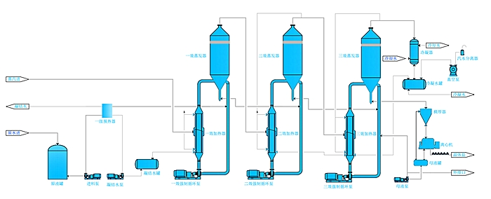 在多效蒸發(fā)器中,可將二次蒸器當(dāng)作加熱蒸汽,引入另一個(gè)蒸發(fā)器,只要后者蒸發(fā)室壓力和溶液沸點(diǎn)均較原來(lái)蒸發(fā)器中的為低,則引入的二次蒸汽即能起加熱熱源的作用。同理,第二個(gè)蒸發(fā)器新產(chǎn)生的新的二次蒸汽又可作為第三蒸發(fā)器的加熱蒸汽。這樣,每一個(gè)蒸發(fā)器即為一效,將多個(gè)蒸發(fā)器連接起來(lái)一同操作,即組成一個(gè)多效蒸發(fā)系統(tǒng)。加入生蒸汽的蒸發(fā)器稱為第一效,利用第一效二次蒸汽加熱的成為第二效,依次類(lèi)推。