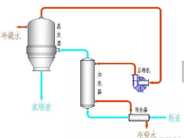 MVR蒸發(fā)器采用壓縮機提高二次蒸汽的能量,并對提高能量的二次蒸汽加以利用,回收二次蒸汽的潛熱。具體為:將蒸發(fā)器產(chǎn)生的二次蒸汽,通過壓縮機的絕熱壓縮,使其壓力、溫度提高后,再作為加熱蒸汽送入蒸發(fā)器的加熱室,冷凝放熱,因此蒸汽的潛熱得到了回收利用。冷料在進入蒸發(fā)器前,通過熱交換器吸收了冷凝水的熱量,使之溫度升高,同時也冷卻了冷凝液和完成液,進一步提高熱的利用率。