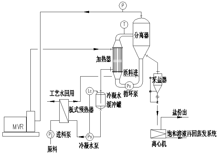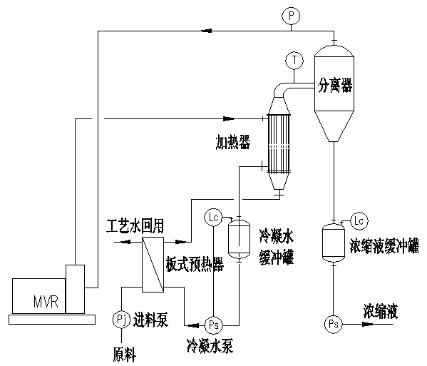 1、對于在蒸發(fā)過程中無結晶時,系統(tǒng)比較簡單,系統(tǒng)由預熱器、蒸發(fā)器(可以采用升膜式或降膜式)、分離器、MVR壓縮機和接收罐組成(如下圖)再配出料泵及控制部分,組成一套完整的MVR蒸發(fā)器系統(tǒng);蒸發(fā)可以是常壓或負壓,根據物料的特性而定,負壓蒸發(fā)時要考慮出料泵的汽蝕余量克服系統(tǒng)的真空。